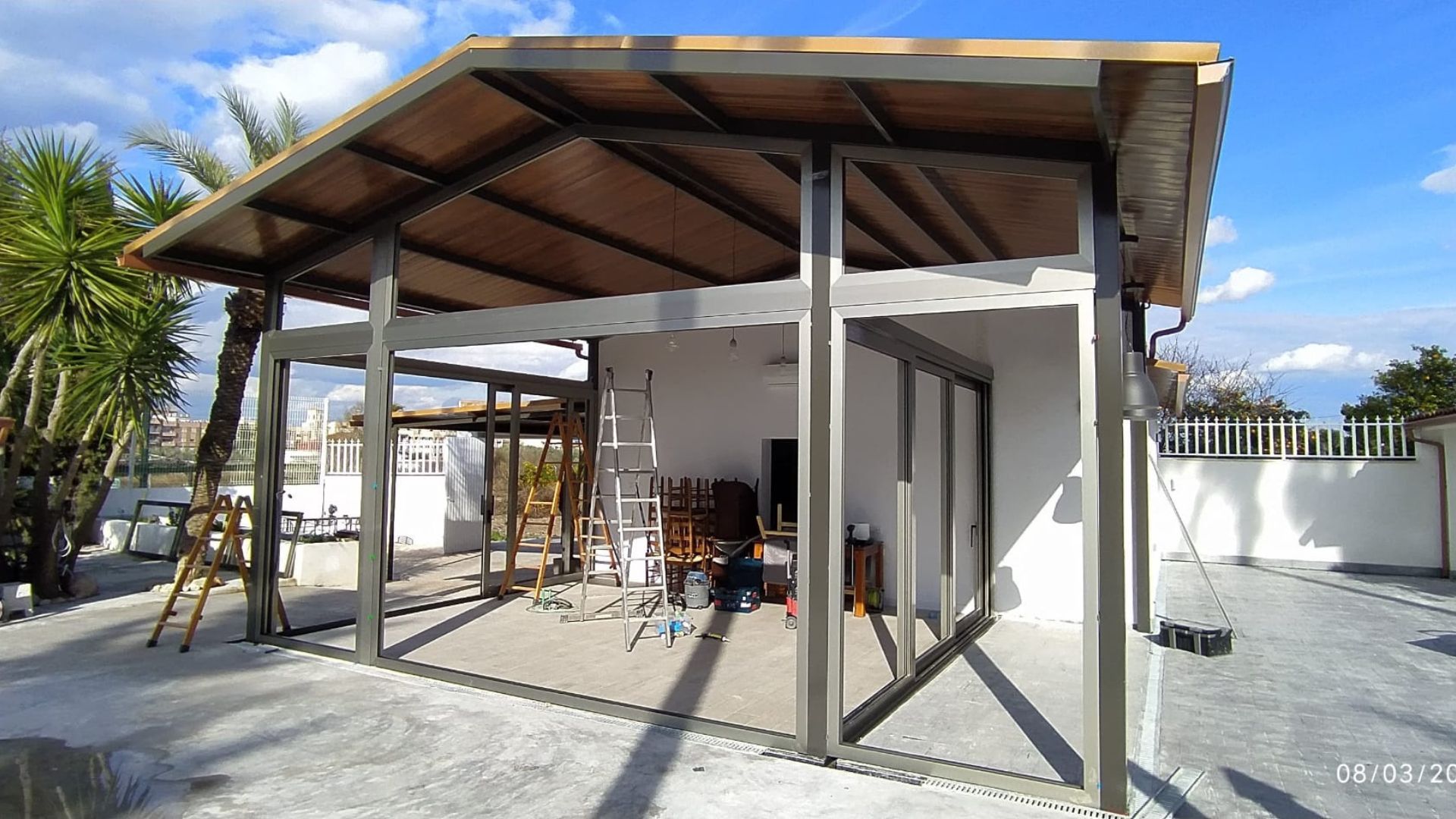 Se ha realizado el forrado de la estructura metálica con chapa de aluminio plegada, aportando un acabado moderno, duradero y perfectamente integrado con la arquitectura existente.