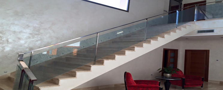 Acabado final de la escalera, baranda de vidrio y acero. El cristal se fabricó laminado con fibras grises entre vidrios. Diseño exclusivo y personalizado.