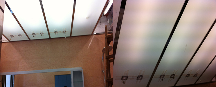 Colocación sobre estructura de acero cristal laminado blanco en el techo de un baño, con iluminación por encima de los vidrios y ojos de buey incrustado en el cristal.