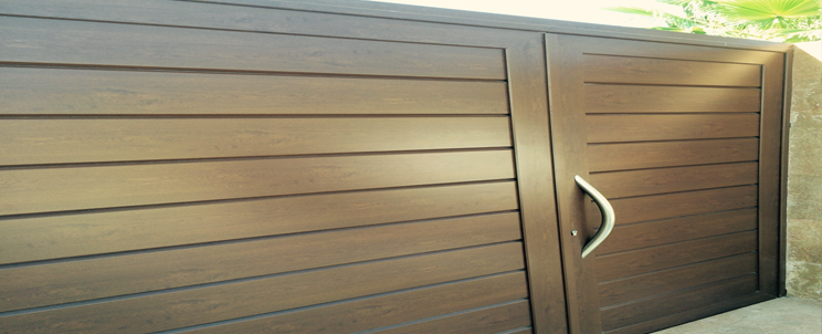 Portón de aluminio imitación madera colocada en acceso a jardín.
