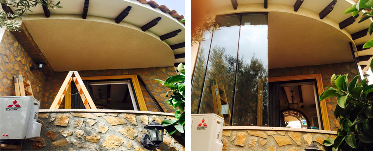 En este proyecto en la primera zona conseguiremos la simulación a muro cortina en cerramientos de porches con vidrio cámara 6+6 anti robó 20 cámara 6 control solar bajo emisivo. En uno de ellos al igual que la sustitución del resto de ventanas en vivienda estrenaremos nuestra nueva serie de corredera con las máximas prestaciones del mercado y por su diseño la mayor en campo de visión. En la segunda zona involucrada en el proyecto, otro cerramiento adaptaremos una puerta gama alta entre vidrios comentados.