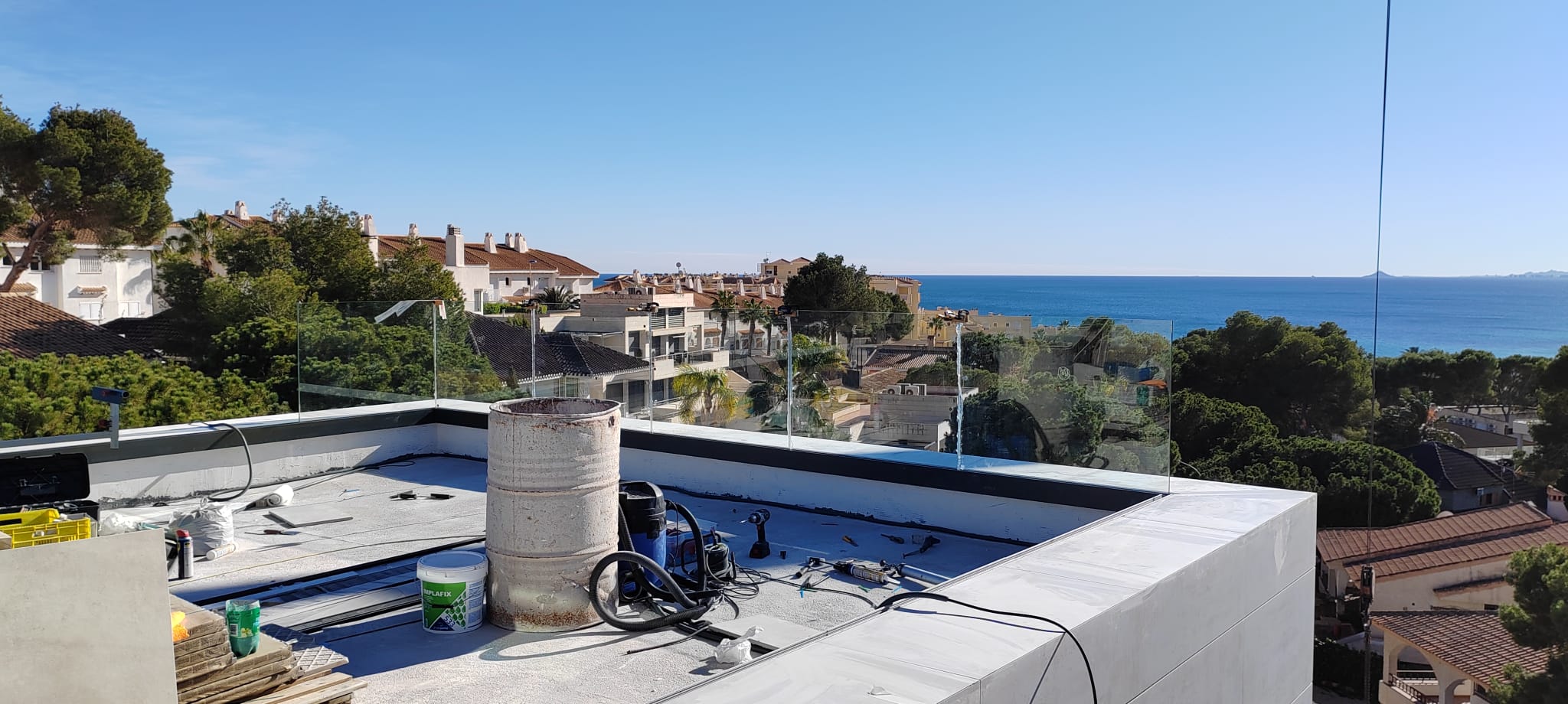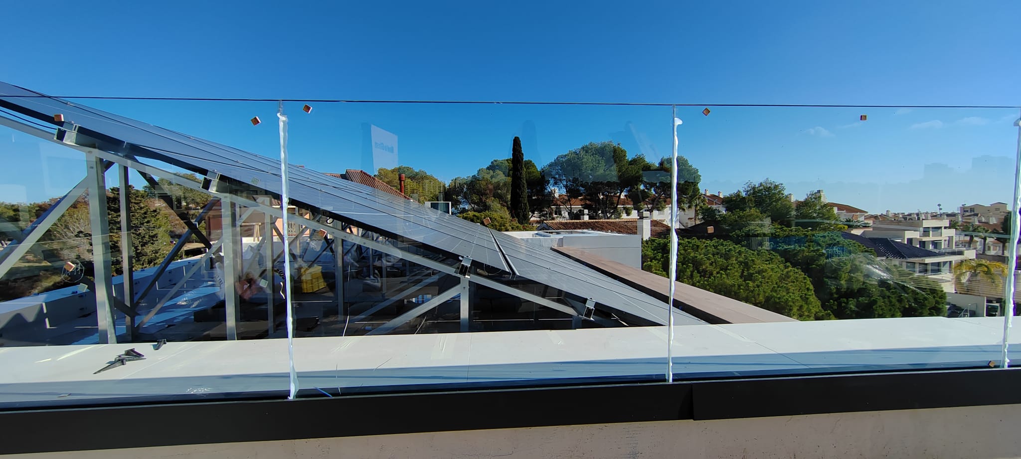 Se han instalado barandillas de vidrio laminado 10+10 en exteriores y barandillas interiores con vidrio templado laminado Reflectasol, aportando seguridad, transparencia y un toque contemporáneo.